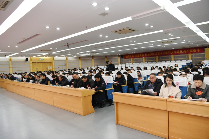 党委副书记、院长姚应水代表校党政作题为“锚定目标  攻坚克难 为加快推进高水平医科大学建设而不懈奋斗”的工作报告。报告指出,一年来,学校深入学习贯彻习近平新时代中国特色社会主义思想,聚焦高水平大学建设和博士学位授予单位立项建设目标,以“开局即冲刺,起跑就加速”的奋进姿态,解放思想、求真务实、开拓创新,党的建设和事业发展取得明显成效。